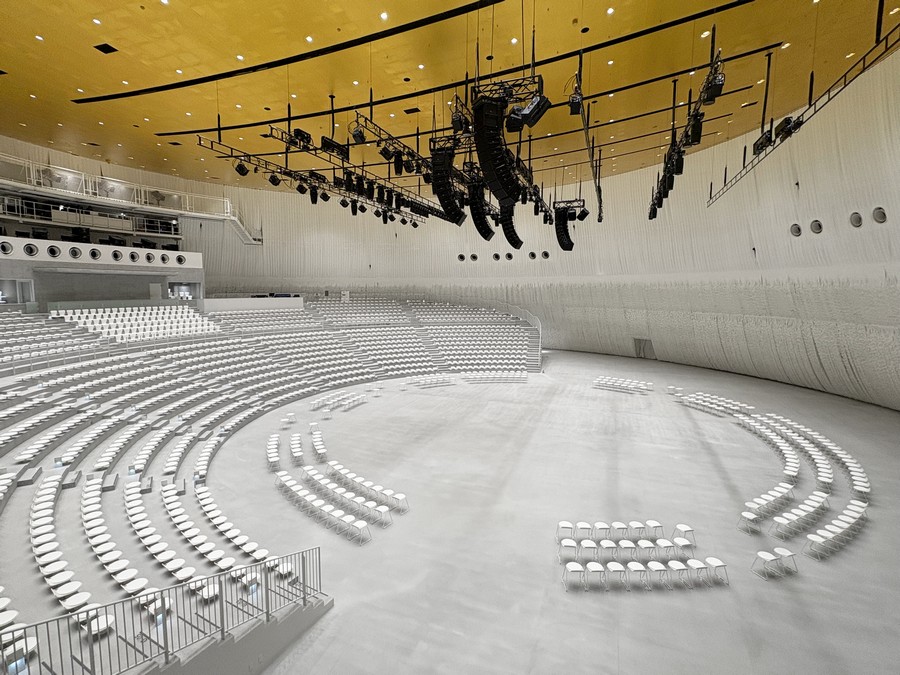 大廳主要以中心舞台形式設計,觀眾席和舞台連為一體,是單坡道的圓形劇場,營造出觀眾與表演者合而為一,充滿生命力的慶典空間。內部為直徑50米、高約15米的單一空間,牆壁四周都被從天花板到地面逐漸蜷曲的富有光澤的白色織物覆蓋。地面和觀眾席也全部采用純白色,營造出仿佛被白霧籠罩的空間。館內計畫利用牆壁、地面和天花板進行大規模投影映射。