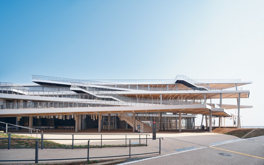 傾斜延伸的帶狀屋頂構成該建築最大特色。其傾斜角度呼應關西地形的凹陷走向,朝著淀川河口方向延伸。此乃板塊擠壓形成的地貌皺摺,受中央構造線影響產生傾斜角度。這片由地球活動孕育的基底,滋養了淀川水系及包含人類活動的生態系統。建築條紋方向不僅對應大阪地形,更與大阪灣海風方向一致。帶狀結構既能捕捉海風導入室內與屋頂廣場,形成天然風道系統,綠化帶的蒸散冷卻效果更強化了降溫機能。設計團隊企圖創造建築與庭園、人工與自然相互滲透的場域,透過整合建築與地景設計,以緩坡銜接屋頂與地形。基地原生植被如芒草等被大量運用,營造野趣盎然的植栽景觀。猶如生物與環境互動般,此處的光影流動、風水交融與植物群落,將共同形塑支撐人群交流的微氣候系統。