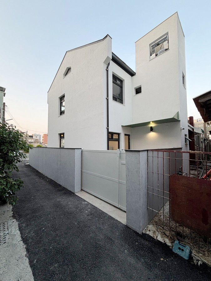 在面對周遭同為二層加強磚造的建築群環境,我們謹慎的控制介入的方法,維持了整體環境宜於步行的都市空間尺度,盡可能在有限的基地面積中,保有庭園的可能性。而在建築物的部分,本次嵌入的方形量體有四個,包括服務盒、綠盒、房間盒與動線盒,分別滿足衛浴、臥榻、房間與樓梯等機能,除此之外,這些量體也同時分別形塑了室外入口空間、調和自然介面以及增添空間的層次等具生活性質的空間體驗。