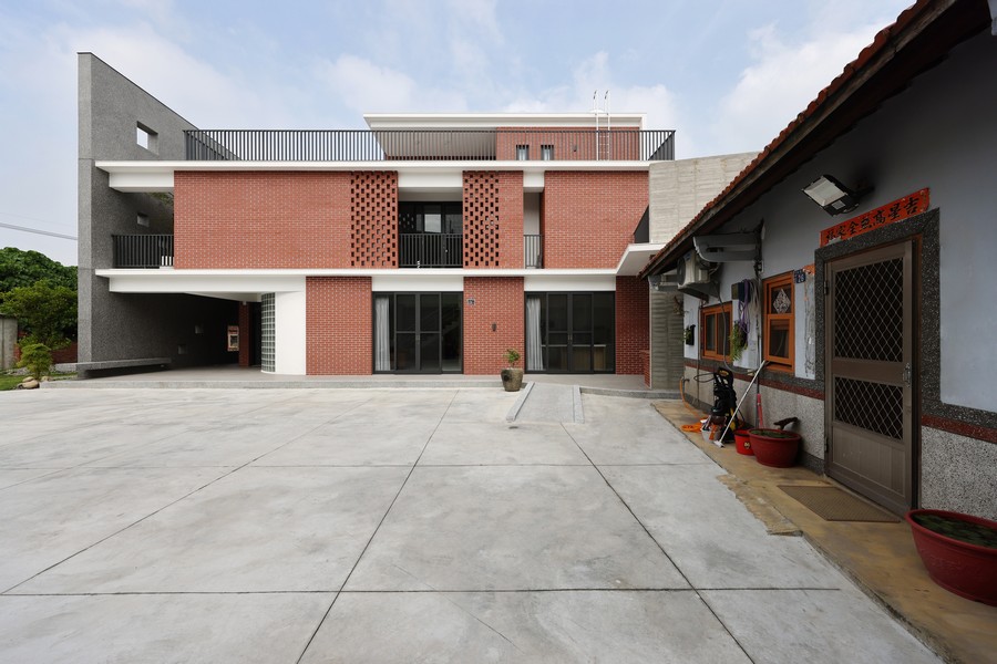 整體建築仍以傳統三合院的型式與既有老厝建築圍繞「埕」作為核心發展為概念,建築物各層主要開口包括進出入口、落地窗、陽台及露台等半戶外空間皆面向「埕」,將建築內外串聯在一起,形塑大家庭的鄉村聚落生活意象。外牆材料除了運用紅磚材料回應閩南建築環境的意象外,也運用紅磚牆創造雙層牆概念達到隔熱的建築技術手法。