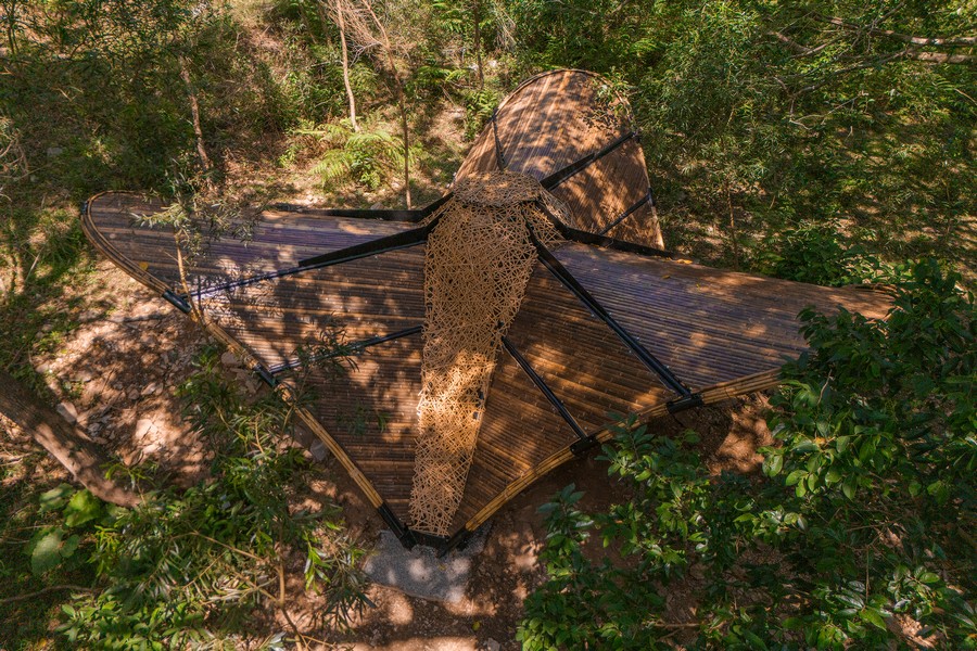 在設計中,我們利用金屬結構在中心建立了一個Y型的立體架構,這個架構向三個方向延展,形成拉力結構,使作品能夠展現出挑的頂棚效果。上半部分,我們運用了竹片編織作為覆蓋物,並透過桂竹片的交錯編織,採取類似木材集成材(CLT)的做法,竹片垂直水平交叉擺放、再用膠水膠合,在兩個向度上形成薄殼結構。這些編織片以組裝方式一一固定在金屬結構上,使竹子的薄片得以傳遞應力,並增強拉力結構的效果。單元邊框由數根竹條集束烤彎成拱形柱,最終呈現出如同一隻蝴蝶停留於森林間的作品,營造出獨特的場所感。(文:陳宣誠)