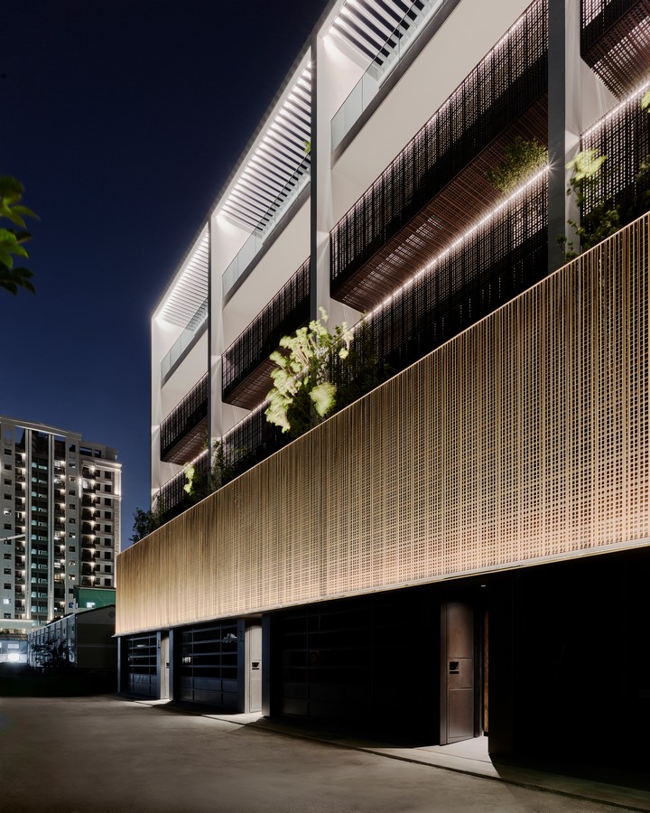 由巷而院,以2F前院內造庭園加深街道景深,並立體連結寬敞挑高的2F、3F主要起居空間。擬自然材質的編織欄杆水平延伸成為屋簷提供各層陽台大面積陰影,為西曬提供深遮陽,也為風的流動提供孔隙。空碧留晴向晚,樹影西斜,陽光由熾烈轉為詩意悄然走入生活。