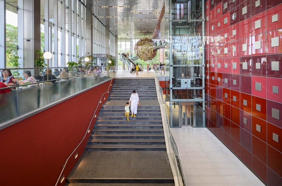 垂直動線設計將樓梯、電梯融為空間構成的一部分,使大廳保持穿透感,並引導使用者自由穿梭。