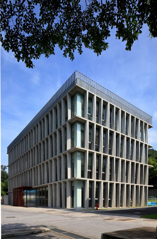 建築外部,以鋼模板場鑄方式完成。以方柱切削語彙形成之遮陽、導水柱列及簷板,形成簡單節奏變化之立面秩序。構造上,嘗試將建築結構系統、鋁窗、外部遮陽柱列等系統元素由內至外分層疊合,試圖造成整體建築構造關係之鬆解與自明。