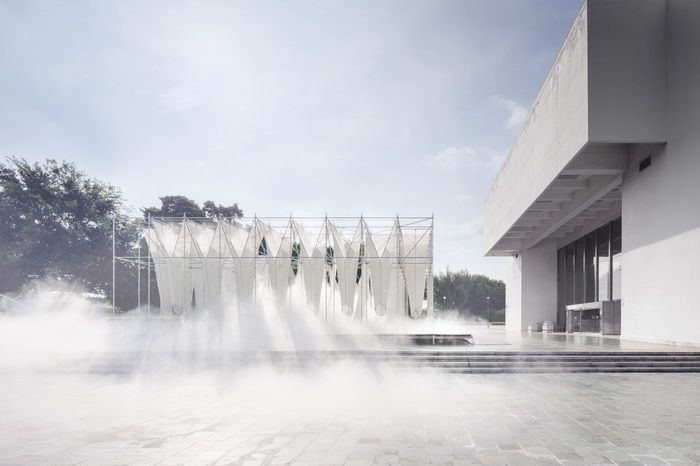 《供霧所》,策動一場關於微氣候的藝術事件,透過水霧使身體知覺展開,賦予不可見的空氣調節一個可理解的形式。層疊織網構架成為了霧的容器,流動漂移,邊界清晰而模糊、視界穿透或隱蔽。