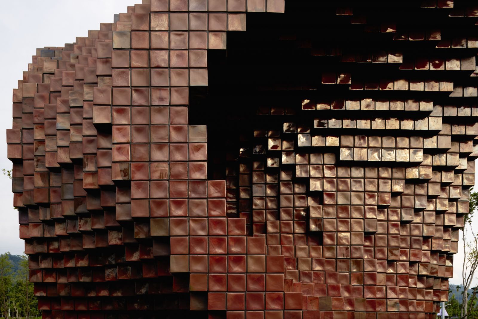 雕塑源於南投動感自然景觀的特點。南投是1999年921地震的震央,台灣中部地區是地質力量集中的位置,以其極為陡峭的山地景觀而聞名。這種無形的自然力量透過數位技術與當地文化的融合,以視覺的形式表現出來。陶瓷立方體由本地水里蛇窯的藝術家林國龍先生以傳統的「蛇形爐」製成。(文:noiz)