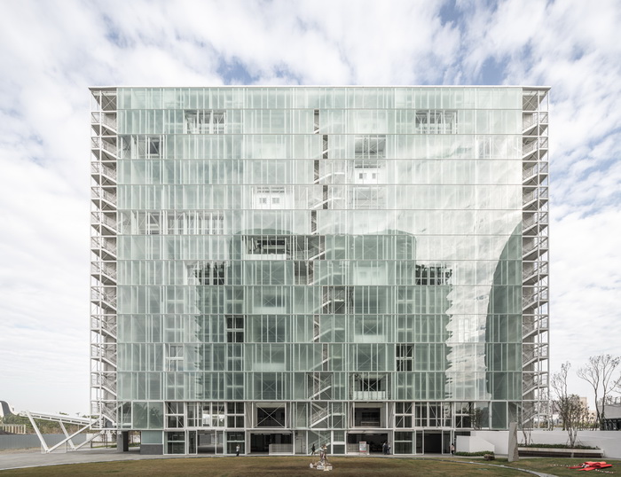 中國醫藥大學教學行政大樓的南向立面由三米寬的鋼構架與不同穿透性的玻璃結合而成。於此皮層中,理性的集中服務性建築元素,交替使用不同模矩尺寸及二種透明度的玻璃帷幕單元,內斂地創造非理性、帶有混亂感的帷幕立面,以一種超凡入聖的華麗鷹架意象、自然有機的分割手法,表現自在的現代性。