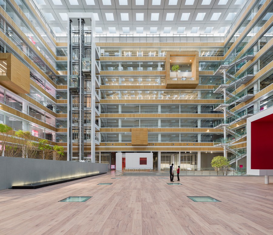 建築是一個約50公尺高的簡潔紅色正方體,外觀配以不規則的大小方形開窗,廠房棟延續辦公棟的外牆建築表情語彙,但以灰色為基調,並選用環保、低施工汙染的預鑄清水混凝土為立面材並鑲嵌陶板及鋁板。建築空間的亮點是總部大樓內挑高10層樓的室內景觀中庭,自然光由鑲嵌於深格子間的天窗進入,舒適宜人,除做為大廳、接待、休息區外,亦可做為企業舉辦活動的場所。公共動線圍繞中庭四周配置,串聯不同樓層以方盒形式懸挑在中庭四面的會議空間與休憩平台,使人員在工作環境中、視線上看得見中庭天光的變化、綠意景緻、人的活動,創造人性化的工作空間,也藉此展現、凝聚企業的嶄新活力。(文:姚仁喜|大元建築工場)