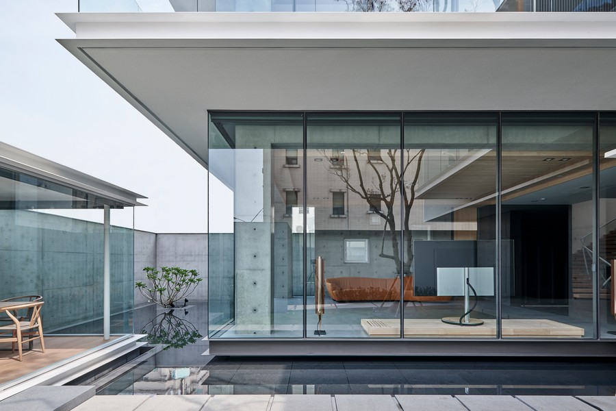 境,開放的前庭與延伸至各層居家視野的樹,景觀、戶外的茶室、車庫與主要的居家空間緊密連結著。沿著戶外客廳邊的水景,輕輕連接著散居式的日常,水的反射與倒影讓視線延續著內與外的空間體驗。建築成為了另一種美好的立基點,像是一種展示屋主簡約生活場景的方式,在重輕虛實之間,住宅恰似一個微型聚落,各空間皆因功能而開展,又因視線而連結,如此簡單的白色建築,展開屋主一家人每日的生活場景。