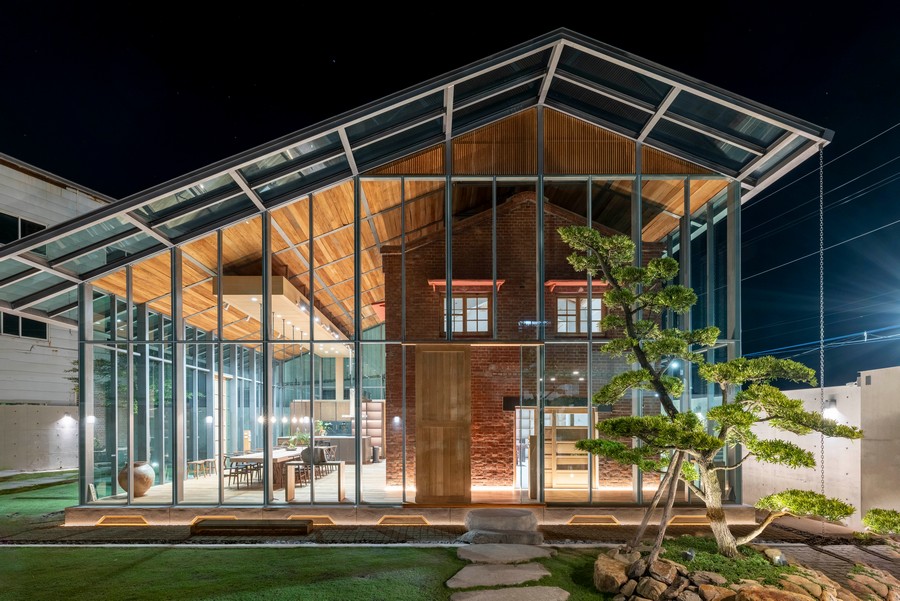 外部設計上,以鋼構搭配大面積玻璃,結合原木地板與紅磚牆面,形成視覺與材質的對話。庭院周圍的清水模圍牆,不僅界定空間,也象徵各世代累積的回憶。整體而言,此案是將建築轉化為「人」與「記憶」的承載體,既保存了家族歷史,也開啟茶道文化的延續與傳承。(文 : 張譯婷)