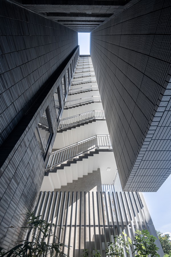 外牆以水沖面藍珊瑚石材、日本筋面射出窯變磚作為基調,輔以銀灰色格柵及深色金屬,形塑垂直與水平的對比構成及量體收合關係。更透過質地與光影變化,在不同時段與氣候中,生成豐富的立體感與陰影層次。